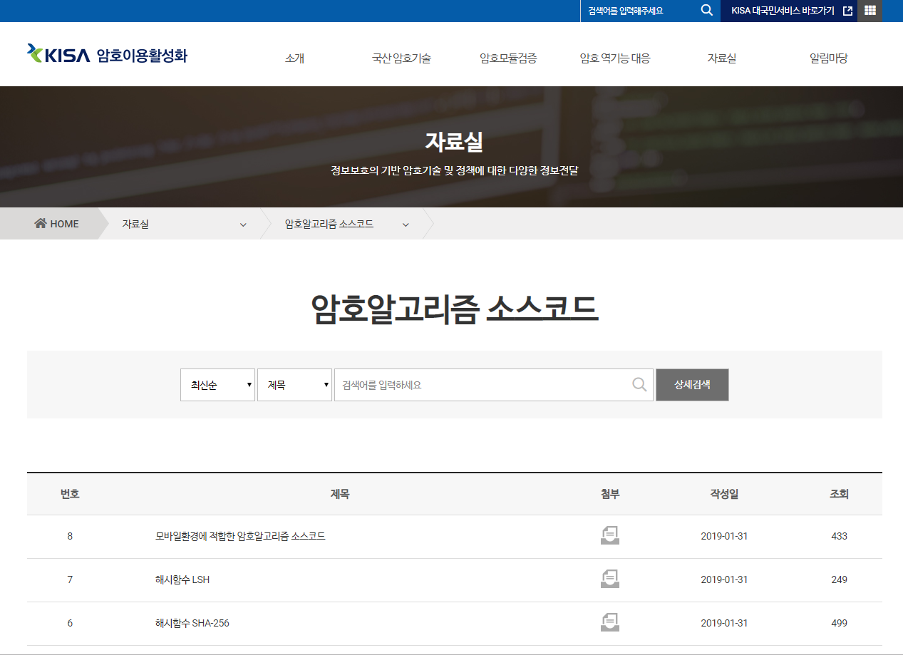 사이트 접속 후 자료실의 [암호알고리즘 소스코드] 메뉴를 클릭하시면 여러가지 암호화 솔루션의 소스코드를 다운로드 받을 수 있습니다.