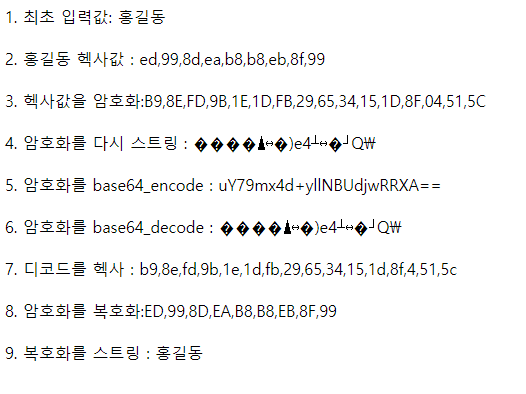 암호화된 Hex 값을 스트링으로 변환하는 것을 안하는 바람에 이틀밤을 꼬박 노가다 작업을 하다가 알게되었네요. 알고나니 별겨 아닌데하는 기분, 늘 느끼게 됩니다. 모쪼록, 저와 같은 고생을 하는 분이 없기를 바랍니다^^