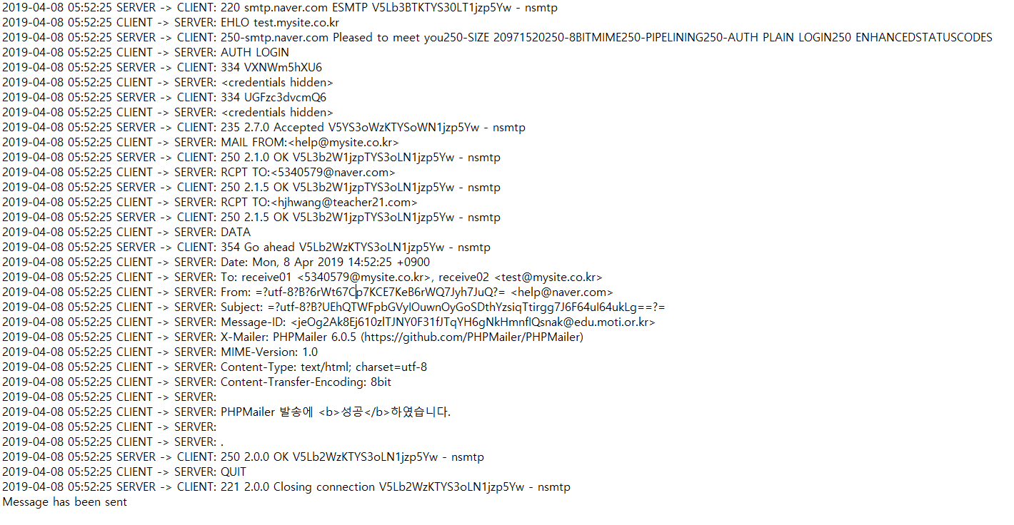$mail -> SMTPDebug = 2; // 디버깅 설정