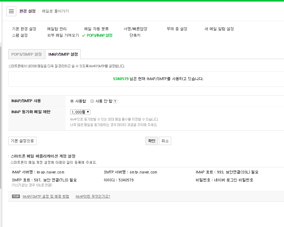 네이버의 smtp 를 사용하고자 할 경우에는 이메일 세팅에서 smtp 를 사용함으로 변경해야 합니다