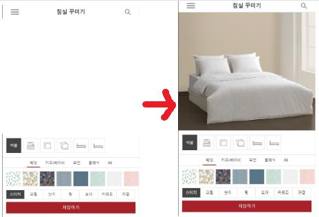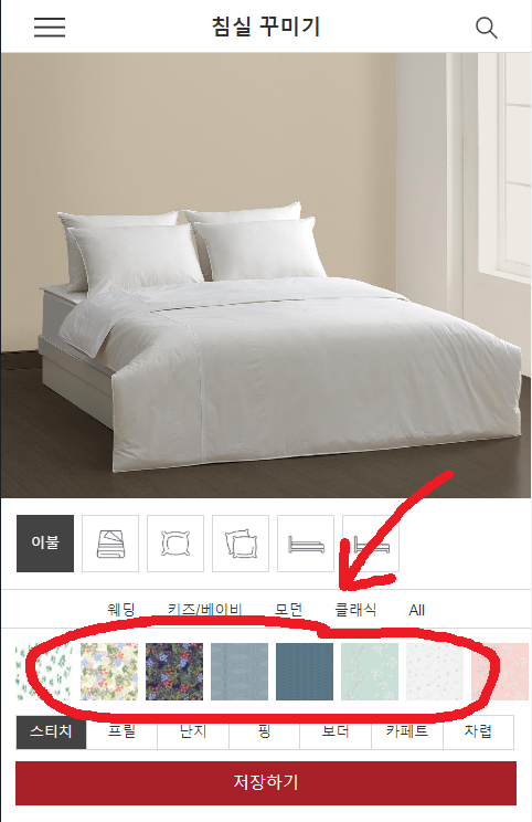 다음은 아래 빨간색 동그라미 부분의 패턴 이미지를 클릭했을 경우, 해당 패턴 이미지를 이불에 덮어씌우는 코드를 살펴보도록 하겠습니다.