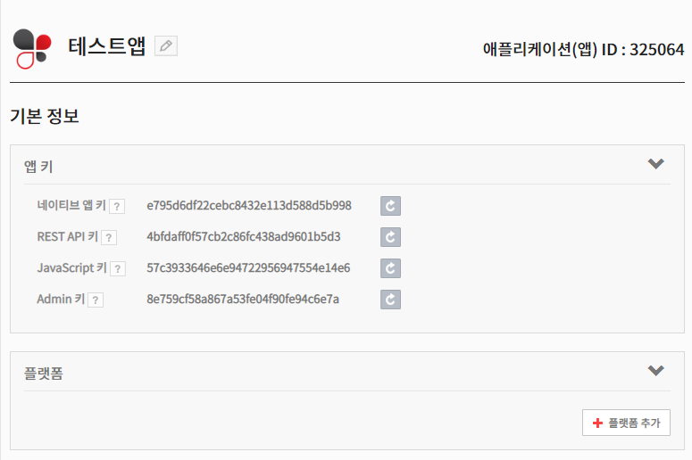 선택한 앱의 상세정보가 표시됩니다. 아까 생성했던 앱키도 보여지게 됩니다.