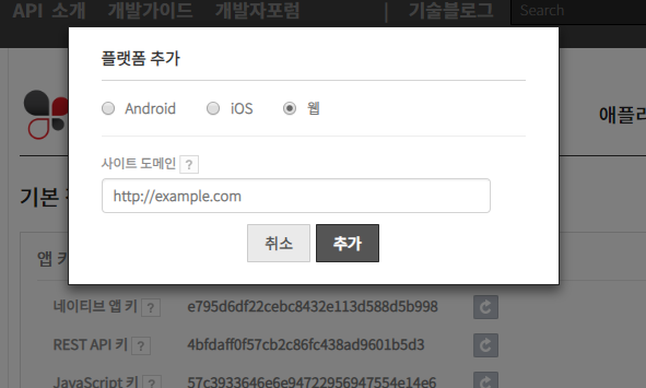 위 화면 우측하단의 플랫폼추가 버튼을 클릭합니다. 사용하고자하는 환경에 따라 Android / iOS / 웹 중 하나를 선택하고 웹의경우는 도메인을 입력해 주고 추가버튼을 클릭하면 등록이 완료됩니다.
