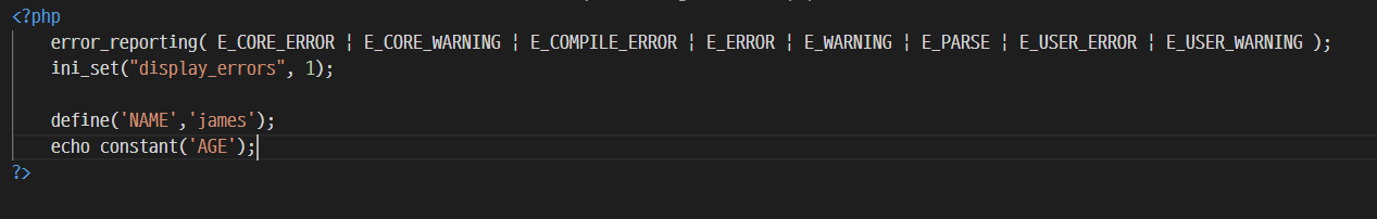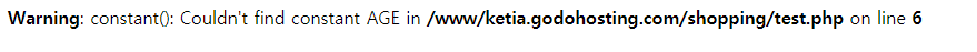 예를 들어 다음과 같이 코딩을 하고 실행을 시키면, define 에서 정의한 상수는 NAME 인데, constant 에서는 정의되지 않은 상수인 AGE 를 출력하려 하기 때문에 오류가 발생하게 되지만, 화면에는 아무런 에러메시지도 표시되지 않게됩니다. (물론, php.ini 에서 에러가 출력되도록 세팅했을 경우라면 출력되기도 합니다)