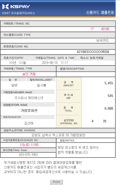 위 검색결과에서 신용카드전표를 클릭하면 아래와 같이 영수증이 보여지게 됩니다