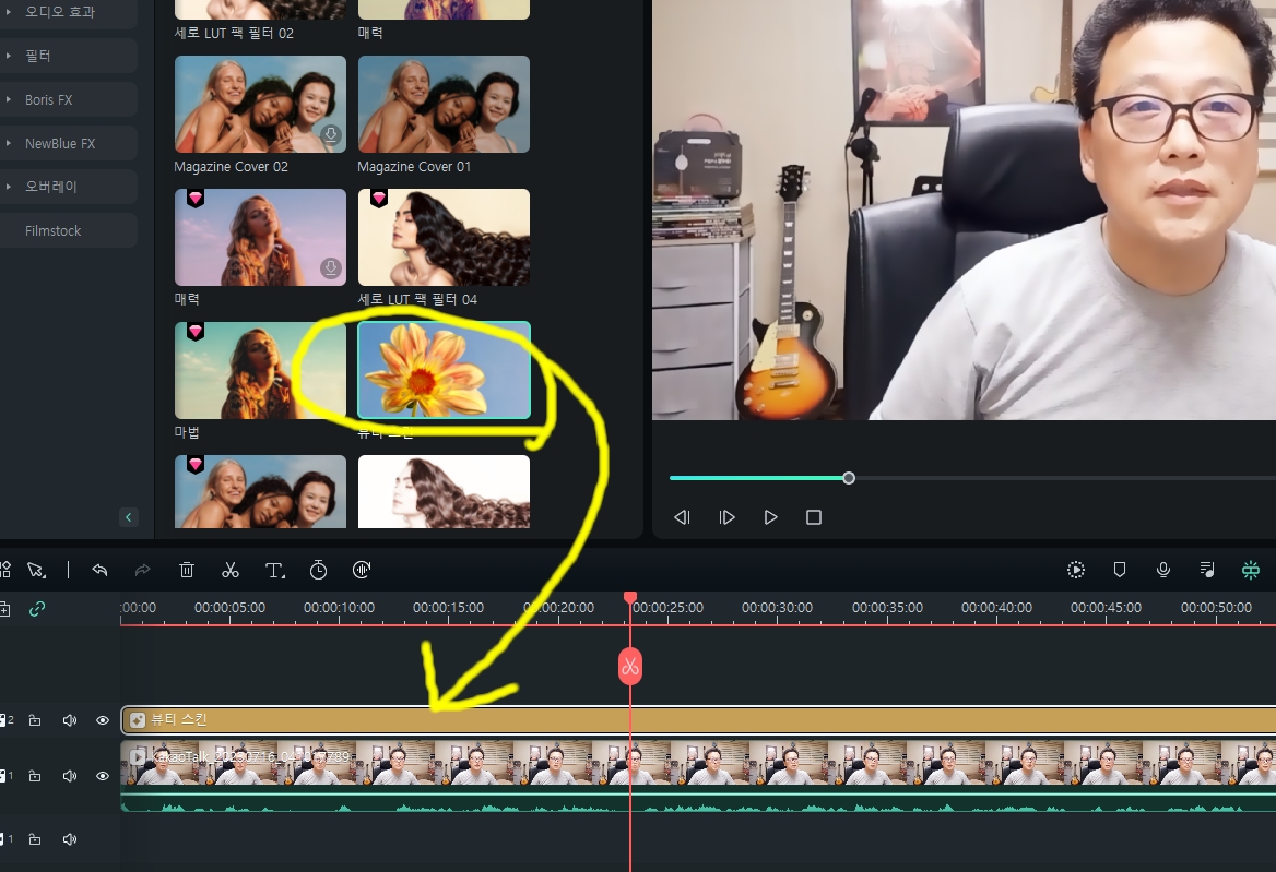 동영상의 얼굴을 보정하려면, 아래 화면처럼 '이펙트 효과 아이콘을 클릭한 후에, 원하는 필터를 검색하시면 됩니다. 일반적으로 사용되는 잡티제거 등을 하려면 [뷰티] 라고 검색한 후에 [뷰티스킨]을 사용하면 됩니다.