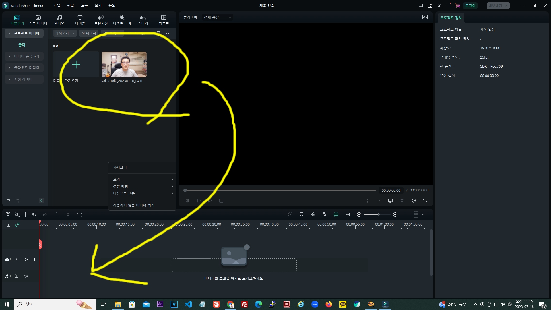 동영상이 아래 동그라미 있는 곳으로 들어왔습니다. 이를 편집하기 위해서는 동영상을 드래그 해서 화살표가 가르키는 위치로 내려주어야 합니다.