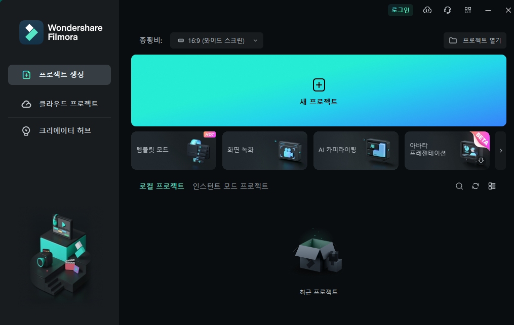 필모라 라는 프로그램은 동영상 속의 얼굴을 다양한 필터를 통해 보정을 해주는 기능을 가지고 있습니다. 프로그램을 설치한 후에 실행시키면 다음과 같은 첫화면이 나옵니다.