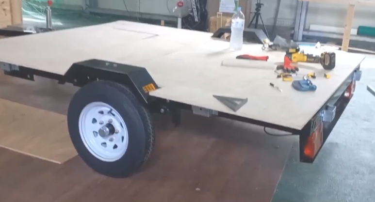 우선, 트레일러 위에 바닥판을 재단해서 붙여봅니다. 도로 주행을 하기 때문에 10mm 두꺼운 볼트와 너트로 확실하게 조여주었습니다.