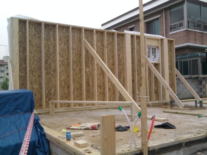 아래 사진은 제가 지었던 목조주택인데요, 마치 목조주택의 스터드(사이기둥)와 같은 역할을 하는 기둥입니다. 목조주택의 기둥도 세로기둥 만으로는 좌우 하중에 취약하지만, 외부에 OSB합판을 붙여줌으로 인해 상하좌우 하중에 강한 구조가 됩니다.